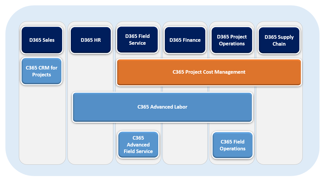 The graph below shows how the SIS Project Cost Management integrates with Microsoft Dynamics 365 across D365 Field Service, D365 Finance, D365 Project Operations, and D365 Supply Chain. Please visit our D365 pages for more information on each module.Â