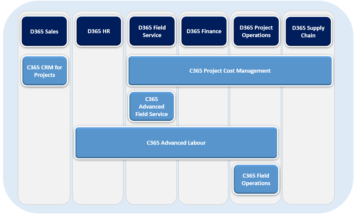 Standard Microsoft Dynamics 365 (D365) integrated with SIS Construct 365 (C365) creates the only complete end-to-end construction and other project and service-based solution on the market. Integration paths are shown below. C365 modules indicate functionality not available in out-of-the-box Microsoft D365.
