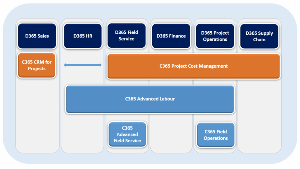The graph below shows the integration paths between the Dynamics 365 (D365) applications and Construct 365 (C365). Standard Microsoft Dynamics D365 integrated with SIS Construct 365 creates the only complete end-to-end construction and project-based solution on the market.
