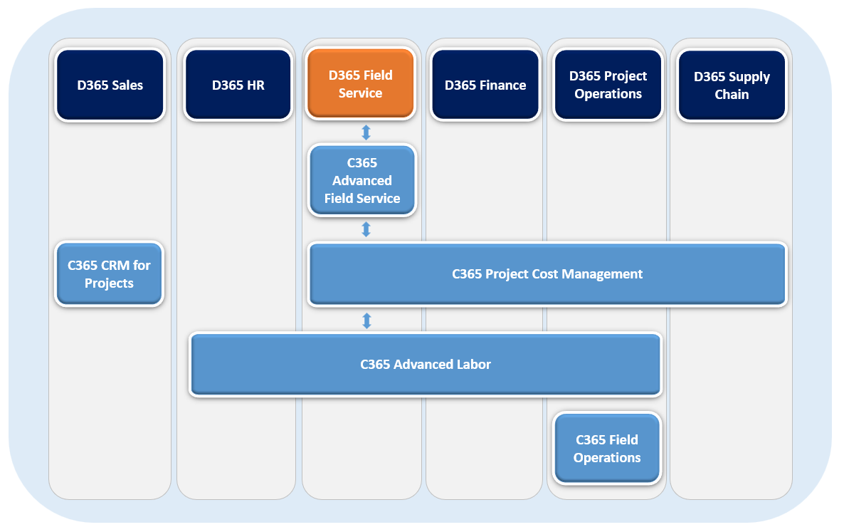 The graph on the right shows how SIS Construct 365 modules integrates with Microsoft Dynamics 365 Field Service. Here you can see that SIS Construct 365, Advanced Field Service, Project Cost Management, and Advanced Labor interface with D365 Field Service. With SIS Construct 365, users have a full financial solution for forecasting, mitigating risk, managing margin gain/fade and variance, updating EAC and other vital functionality for construction project profitability. Please visit our SIS Construct 365 pages for more information on each module.